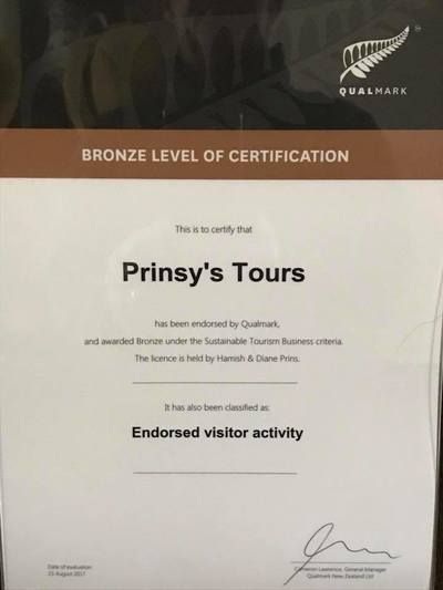 Prinsy’s Tours has also recently completed our first Qualmark assessment, so we are now bench-marking our little tour business against the tourism industry heavyweights. Big and scary but we thought why not! Qualmark have since endorsed us with a Bronze certification, so we're in, hip hip hurray!